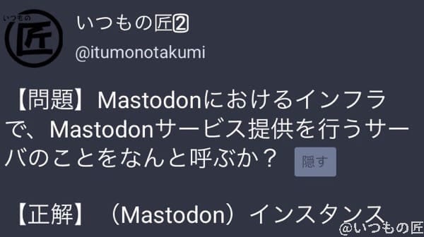こんな感じで、問題と解答のトゥートをするのに使えそうです。英語や試験の問題をトゥートするボットがいずれ現れると思いますが、このように使われていくのだろうと予測できますね。