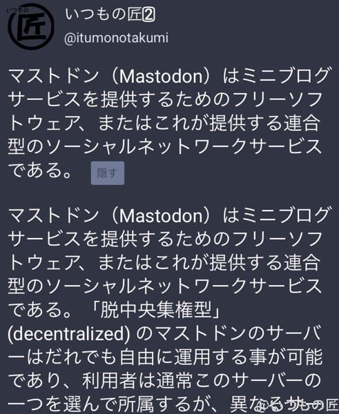 匠の素のトゥートなんかでは、たまに「絵文字が目障りだ」というキビしいコメントをいただくこともあります。そこで、こういう風に隠したトゥートにしてみた方が目障りではないのかもしれませんね。