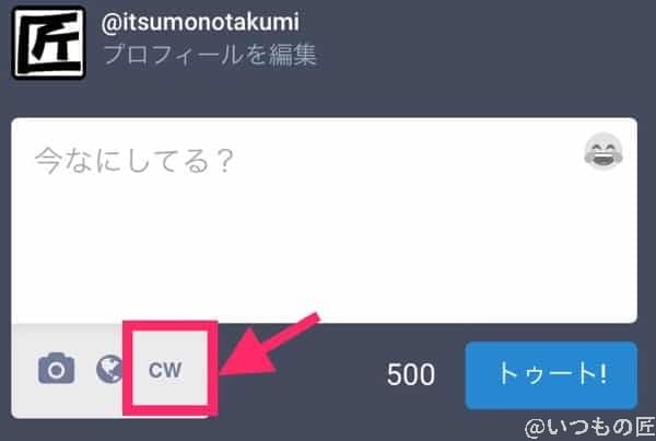 トゥートの入力画面にて、画像のように「CW」ボタンを選択します。