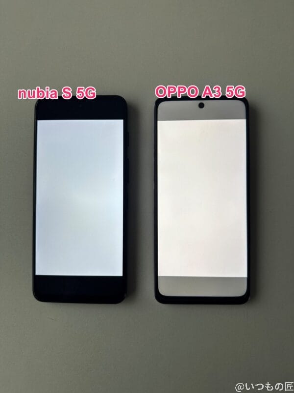 nubia S 5Gのディスプレイは前モデルと同じTFT液晶を採用しており、解像度も同等です。見比べた限りでは、鮮やかさに大きな違いはありません。白い画面で色合いを比較しましたが、どちらも同様の印象を受けました。