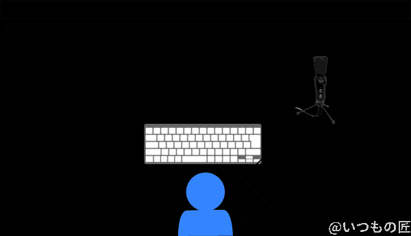 椅子に座った状態で、筆者の口からはだいたい20cmくらいの距離だと考えてください。
